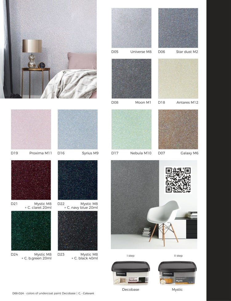 Pittura decorativa per uso interno. Migliaia di particelle scintillanti contenute nella pittura, luccicanti e brillanti alla luce, conferiscono alle superfici un effetto spettacolare! Mystic funziona bene sia in interni molto moderni che classici, cambiando completamente l'aspetto delle stanze. Fai risplendere la tua casa!